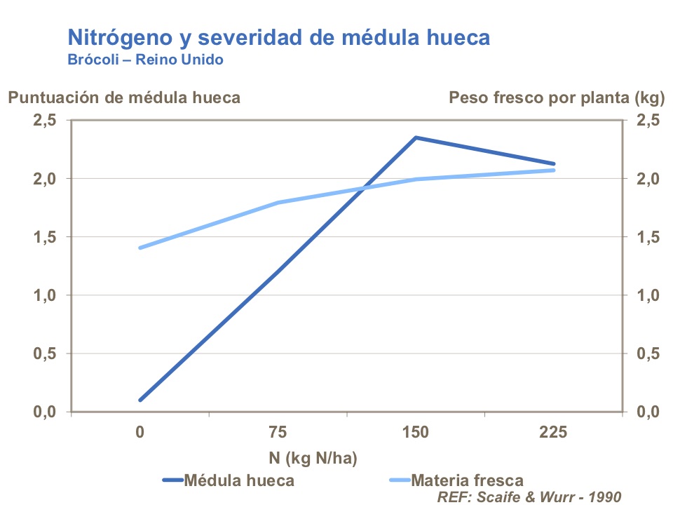 Además, demasiado desarrollo forzado por sobredosis de nitrógeno, sobre todo si esta está fuera de equilibrio con la disponibilidad de calcio y potasio, puede crear un suministro insuficiente de estos nutrientes y resultar en médula hueca.