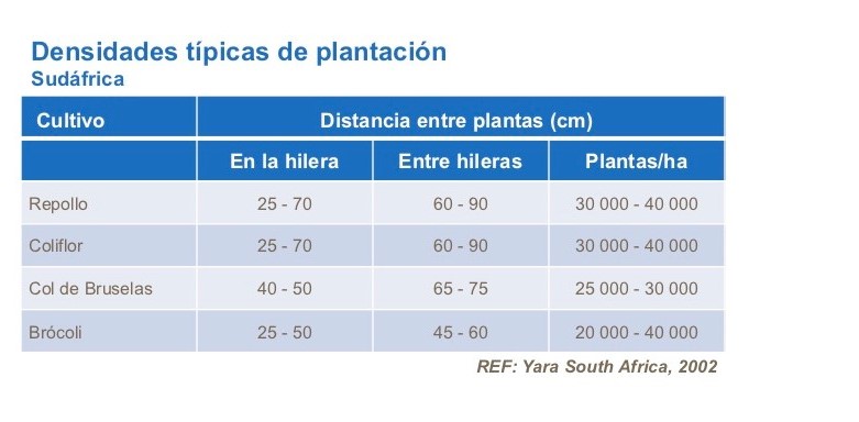 La densidad de plantas en el campo varía de acuerdo con la variedad de brassica, su velocidad de desarrollo y el método de cosechar. Si la meta es producir cabezas más pequeñas, sobre todo bajo condiciones de rápido desarrollo, se puede plantar en forma más densa. Menos densidad produce cabezas más grandes.