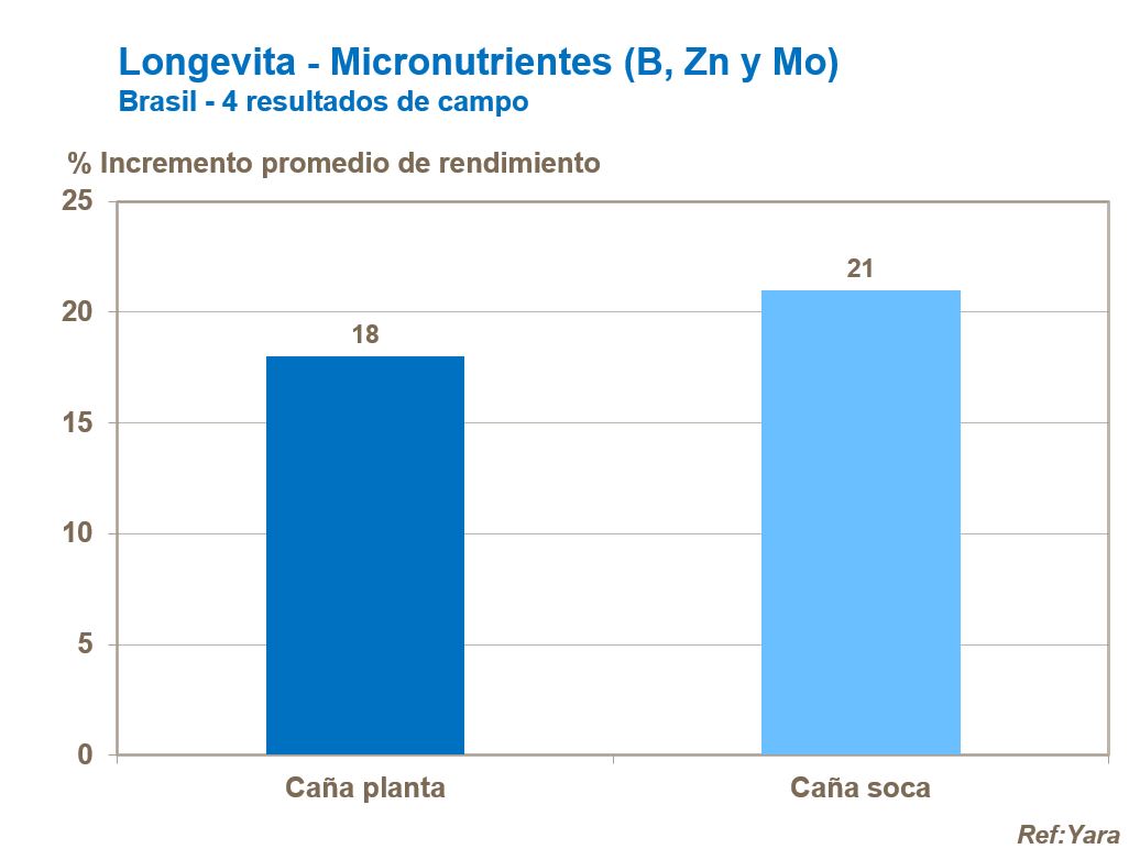 Mientras que el rendimiento acumulativo a lo largo de cinco años usando prácticas de aplicación de fertilizantes estándar obtuvieron 380t/ha, el concepto Longevita produjo un rendimiento de 530t/ha de un total de siete cosechas, con lo cual se ahorró un 30% de los costos de vida del cultivo de caña.