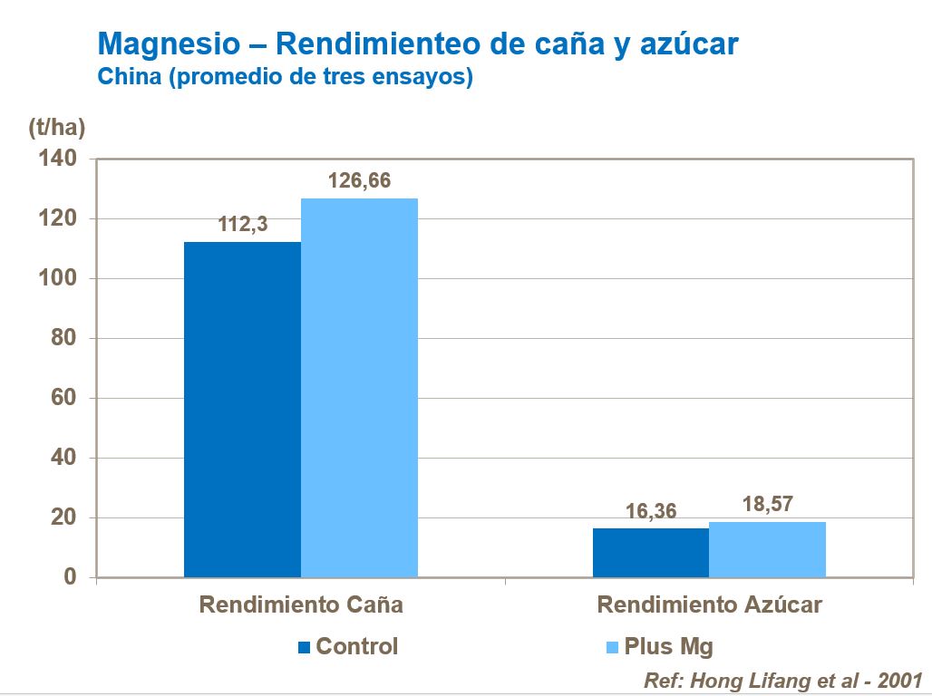 Magnesio está involucrado en la transpiración. A diferencia de calcio, el magnesio es más móvil en las plantas y puede ser translocado desde hojas maduras a crecimiento nuevo y activo. Bajos niveles de magnesio durante periodos de fuerte crecimiento podrá resultar en pobre crecimiento de la caña de azúcar.