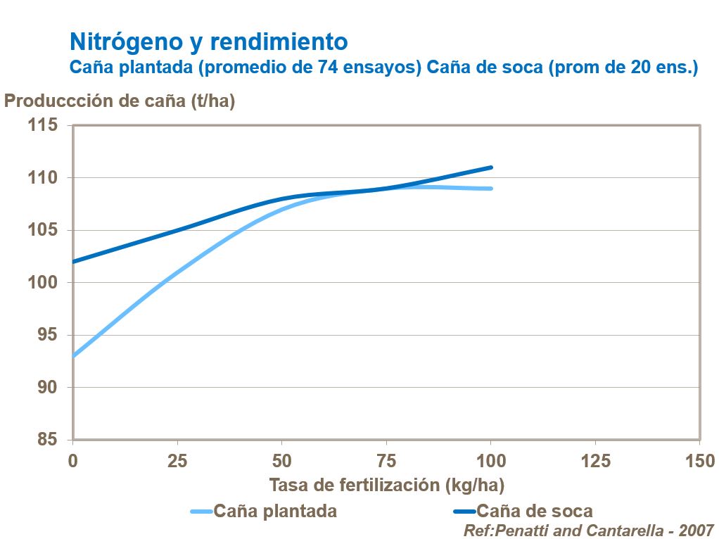 Nitrógeno es importante para altos rendimientos de caña de azúcar. Nitrógeno es requerido en grandes cantidades y ayuda en maximizar la producción de MS (Materia seca) y el rendimiento. Nitrógeno es uno de los componentes principales de proteínas, y esencial para la fotosíntesis y la producción de azúcares. Los cultivos aprovechan los suministros recientemente mineralizados de nitrógeno en el suelo cultivado. No obstante, N fertilizado también ayuda en aumentar el rendimiento en los cultivos altamente productivos. Una respuesta en rendimiento también puede verse en caña de soca que también responden a suministros de N.