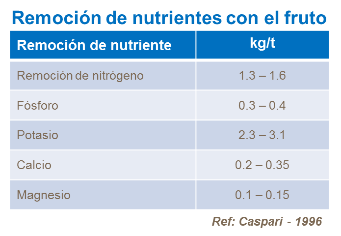 El potasio se requiere generalmente en mayores cantidades que el nitrógeno, la remoción en frutos de un cultivo con una buena cosecha puede estar cerca del doble que la de nitrógeno. La experiencia en Sudáfrica es que la absorción de potasio puede superar los 200 kg/ha, lo que es significativamente superior a la necesaria para el nitrógeno. Sin embargo, hay que tener cuidado ya que un uso excesivo de potasio puede reducir la disponibilidad de calcio y/o magnesio.